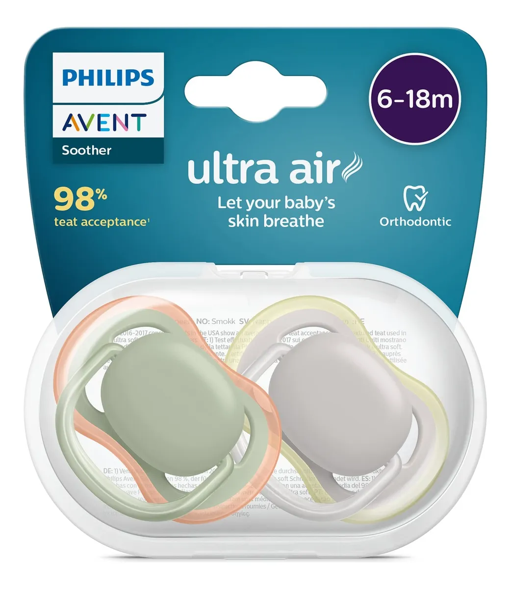 Acalme seu bebê com uma chupeta que permite a respiração da pele e é fácil de encontrar à noite. A Ultra Air noturna tem grandes orifícios para manter a pele sensível, macia e seca, além de um botão que brilha no escuro para encontrá-la facilmente quando as luzes estiverem apagada