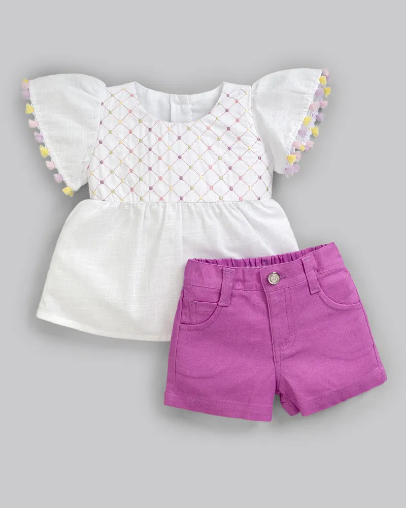 Conjunto Fem Bata c/ Pontos Bordado e Short Lilás G - Anjos Baby