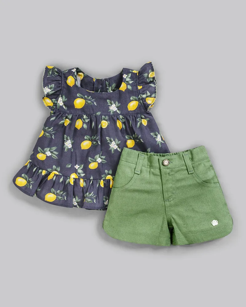 Conjunto Fem Bata Estampa Limões e Short em Linho Verde G - Anjos Baby