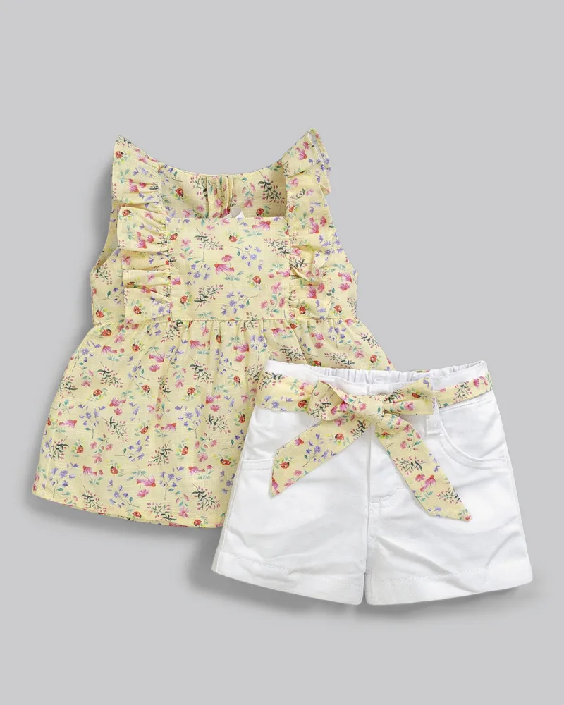 Conjunto Fem Bata Florida Amarelo e Short Sarja G - Anjos Baby