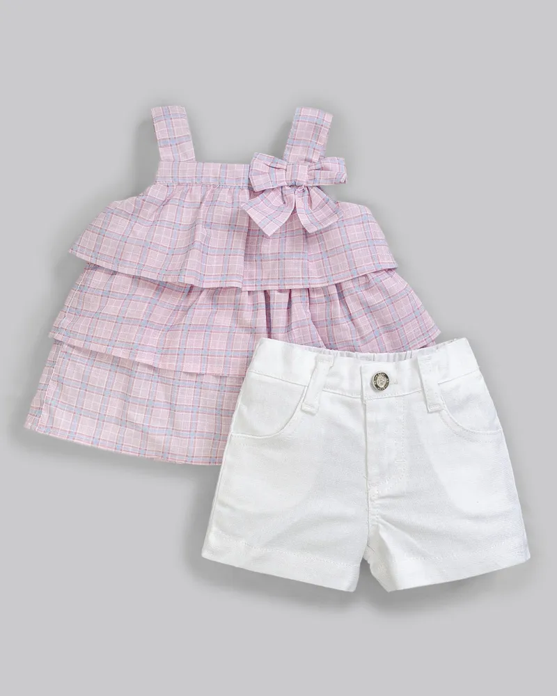 Conjunto Fem Bata Xadrez Rosa e Short Linho G - Anjos Baby