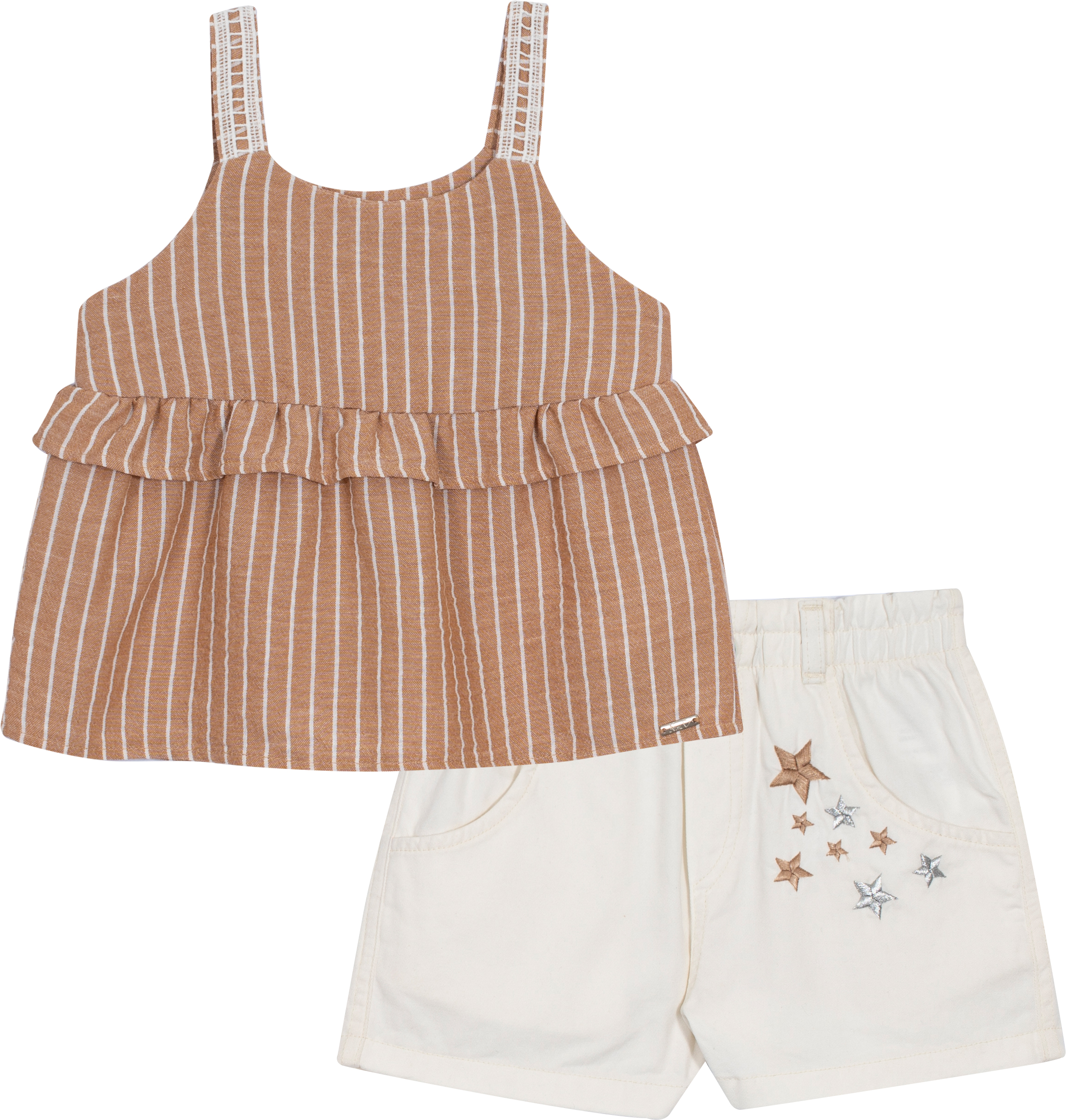 Com design delicado e acabamento encantador, este conjunto é ideal para meninas que adoram se vestir com conforto e personalidade. A combinação de tons neutros e detalhes sutis cria um visual moderno e cheio de charme.