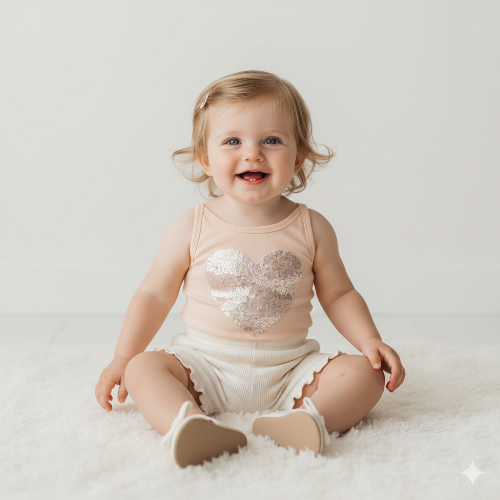 Aplicação central em formato de coração com paetês iridescentes, trazendo brilho e sofisticação, acompanhado da palavra “Amour” bordada.