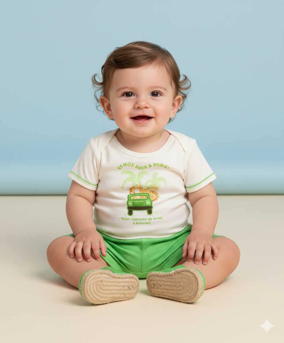Conjunto infantil super divertido e confortável, ideal para os dias de verão. O kit inclui body de manga curta em tom creme com detalhes em verde nas mangas e uma estampa alegre de carro com animais e coqueiros, acompanhado das frases “Vamos para a praia!” e “Fazer castelos de areia e brincar!”, que trazem todo o clima de diversão à peça.
