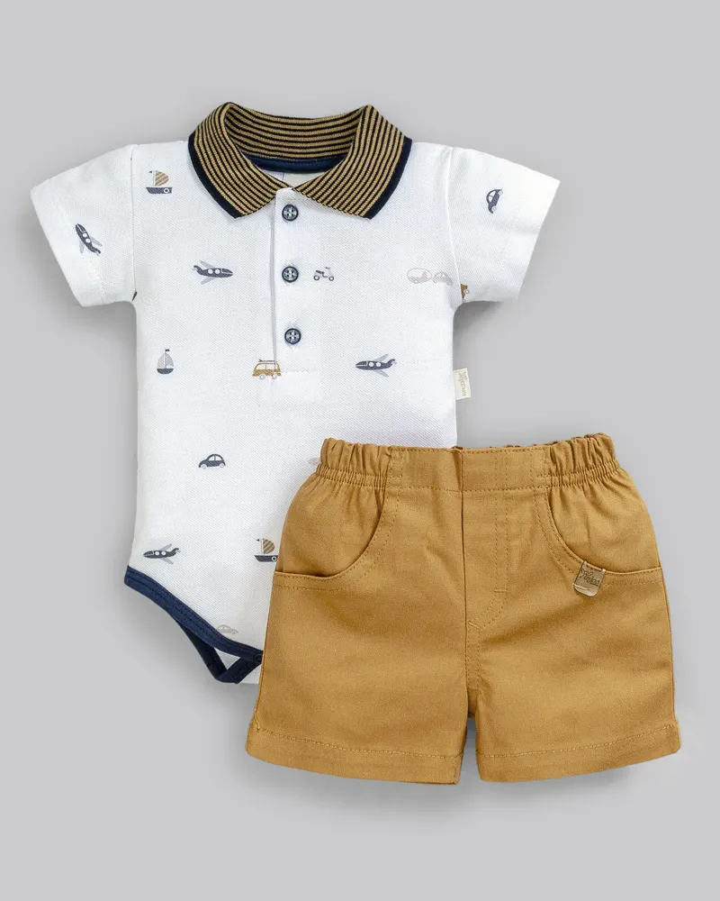 Conjunto Masc Body Veículos e Bermuda Mostarda P - Anjos Baby