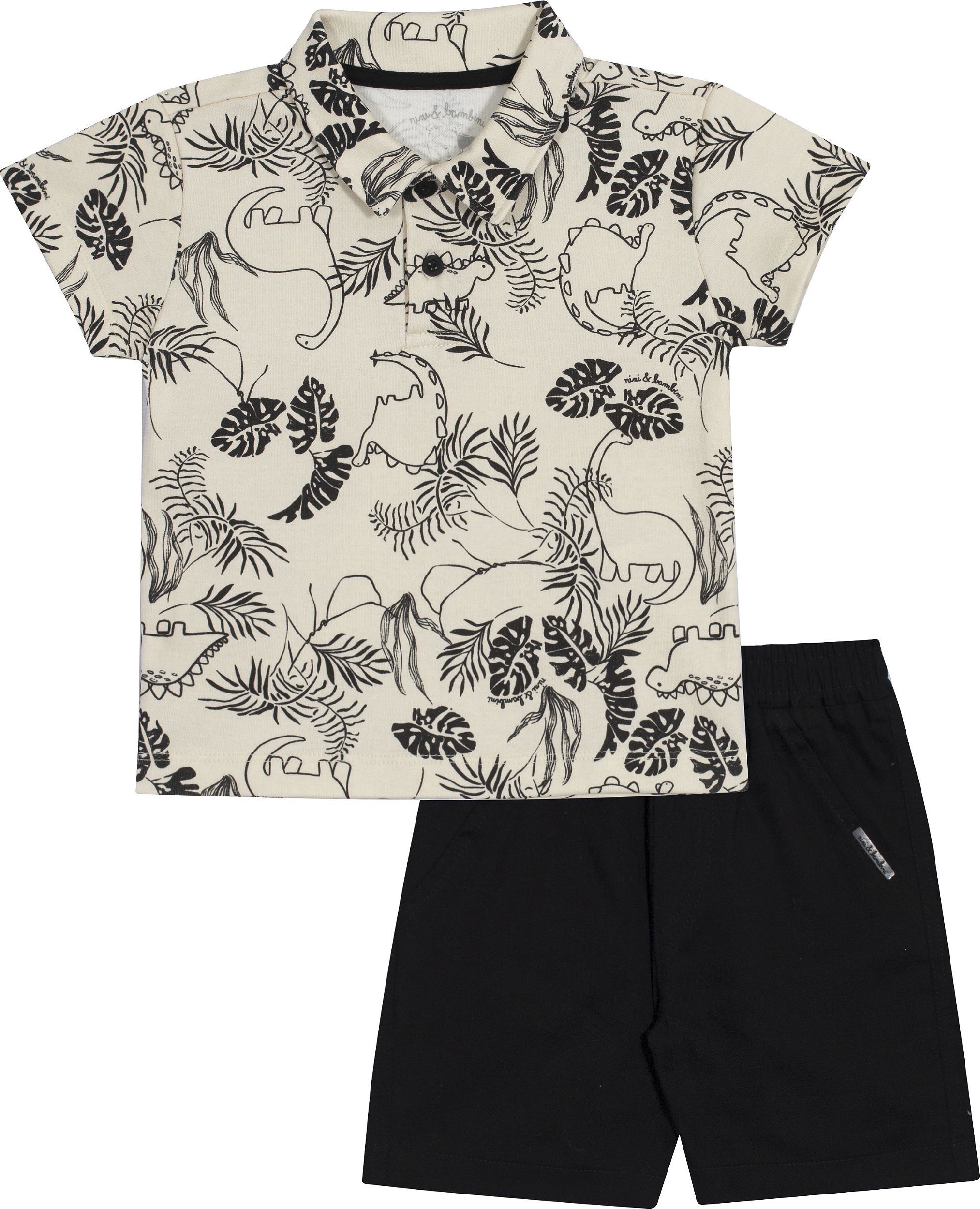 Estampa: Folhagens tropicais e silhuetas de dinossauros em preto, criando um visual moderno e aventureiro.