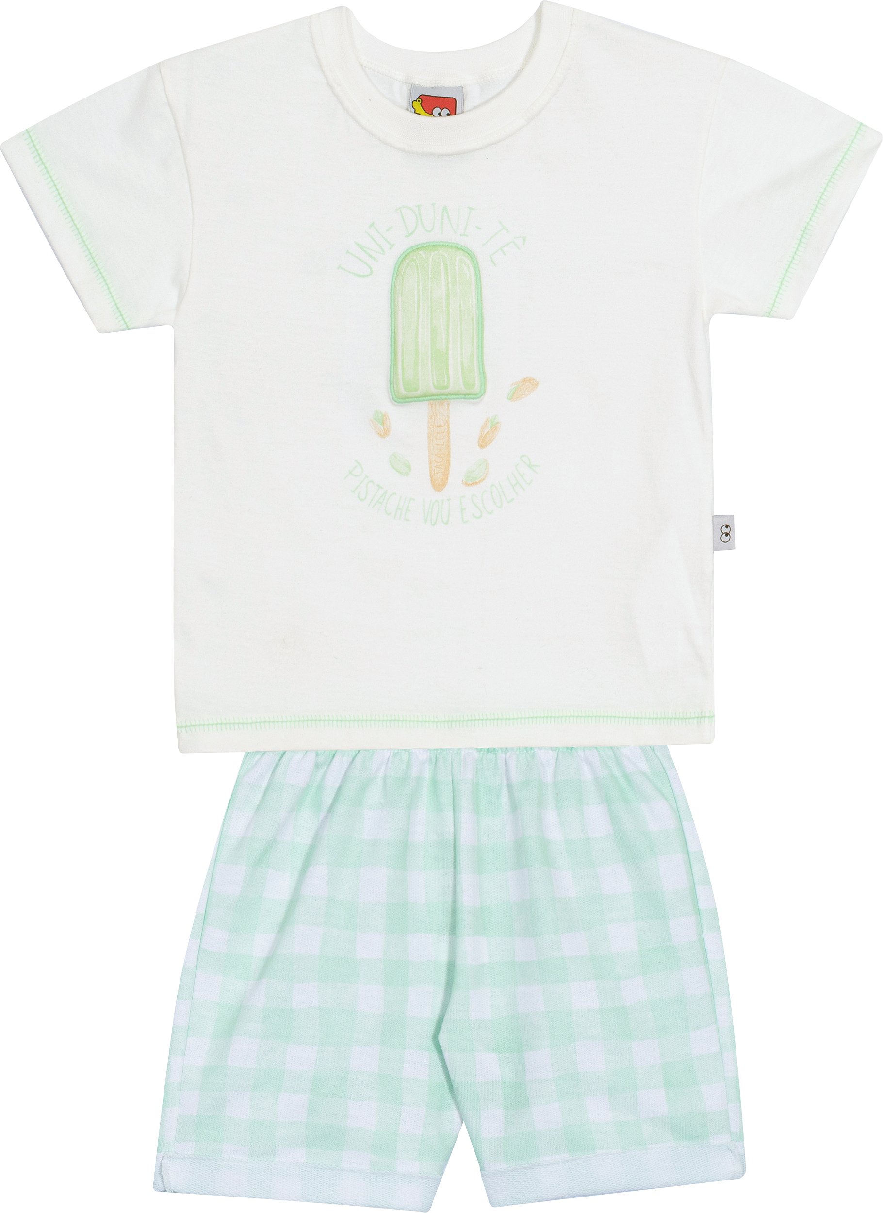 A camiseta branca traz costuras verde-menta e uma estampa central de picolé pistache acompanhada da frase “UNE-DUNI-TÊ – PISTACHE VOU ESCOLHER”, que adiciona um toque lúdico e criativo à peça. Já o short xadrez verde e branco completa o visual com frescor e liberdade de movimento.