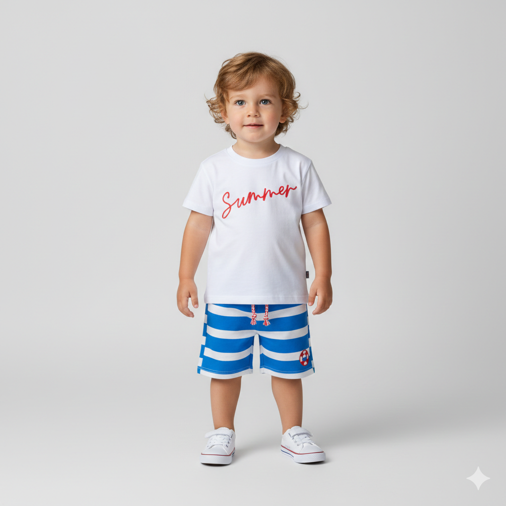 Conjunto infantil leve e divertido, perfeito para os dias quentes de verão. A camiseta branca de manga curta traz a palavra “Summer” em destaque com tipografia vermelha cursiva, transmitindo o clima descontraído da estação.