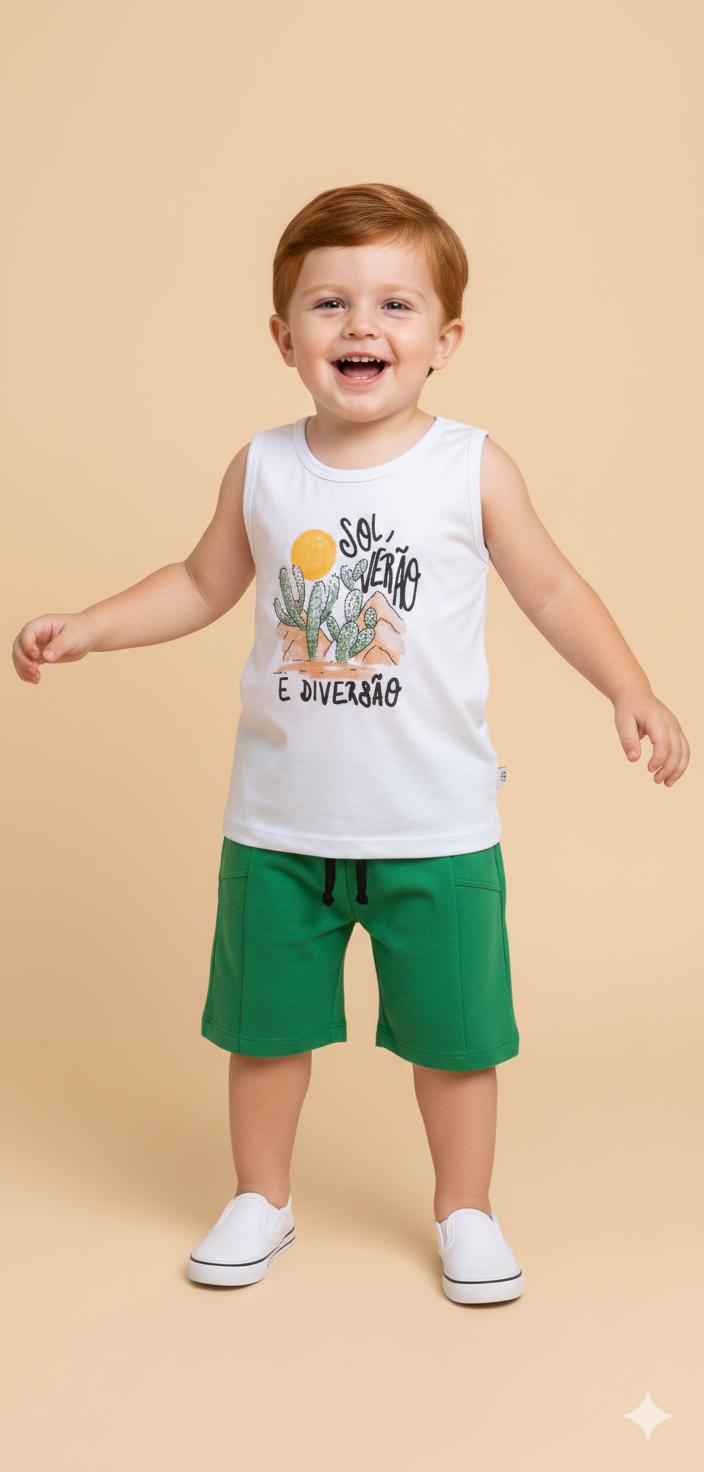 Inspirado na alegria das férias e nas paisagens tropicais, esse conjunto é ideal para crianças que adoram brincar com leveza e personalidade. Com estampa divertida e modelagem confortável, ele une estilo, praticidade e energia positiva.