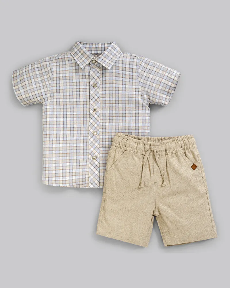 Conjunto Masc Xadrez e Bermuda Linho Bege 01- Anjos Baby
