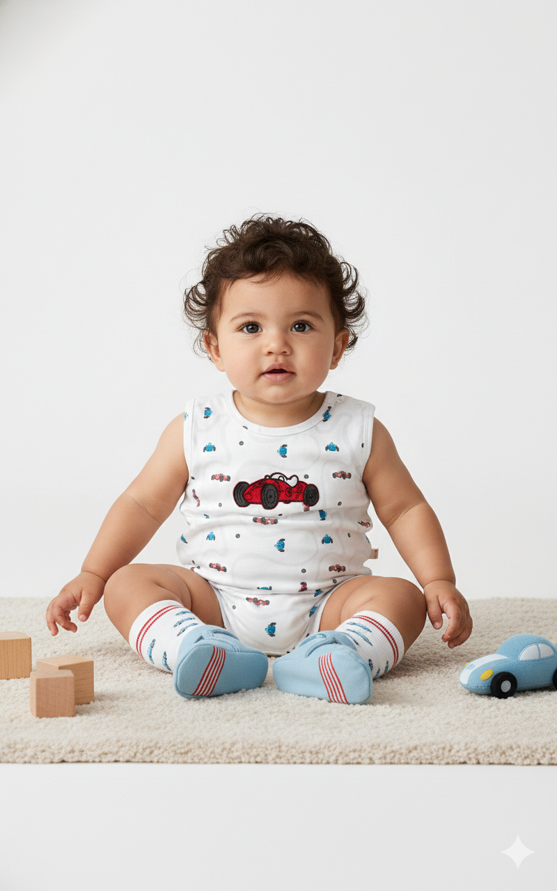 • Estampa temática de carrinhos de corrida em vermelho e azul, com linhas que remetem a pistas, criando um visual lúdico e alegre.