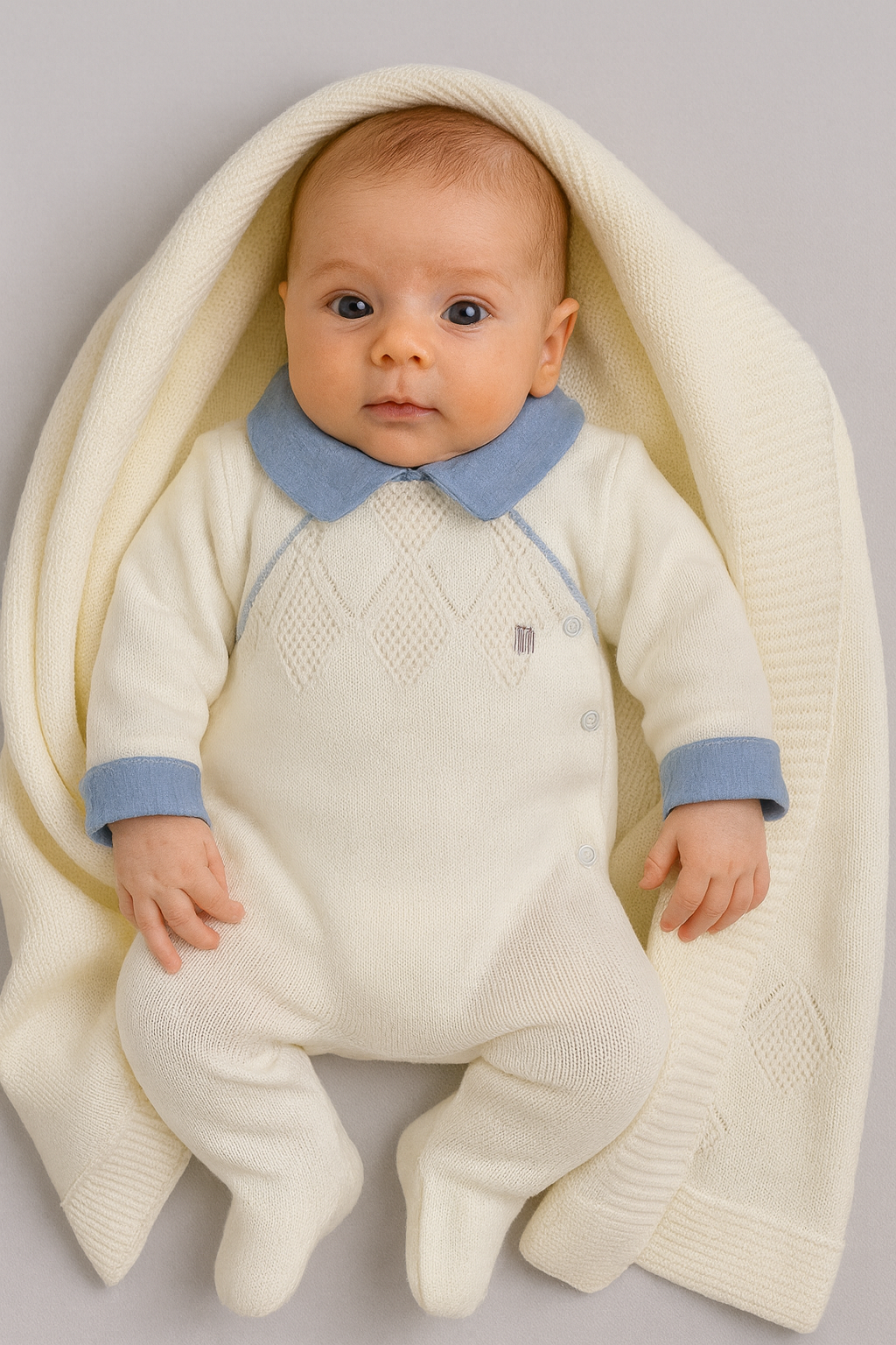 ? Macacão tricotado branco com detalhes em ponto losango, gola e punhos em azul claro