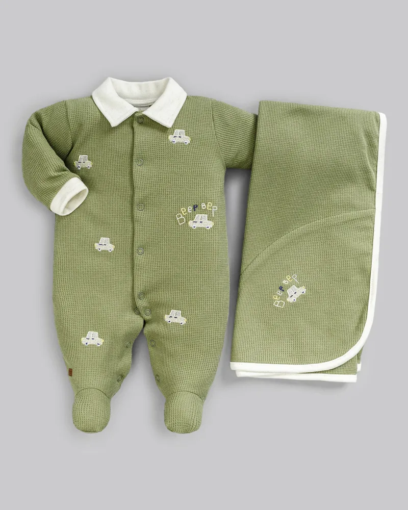 Saída Maternidade Masc Malha Trabalhada Carrinhos Verde RN - Anjos Baby