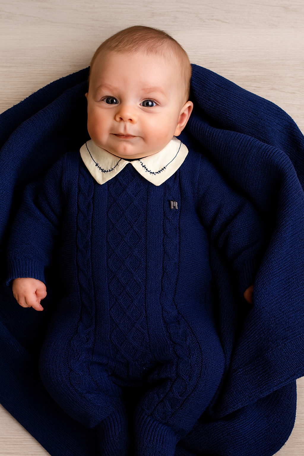 Macacão de tricot com pés: confeccionado em fio antialérgico de alta qualidade, com textura em tranças e losangos na parte frontal. Possui gola branca estilo Peter Pan com bordado delicado em azul, botões laterais e entrepernas para facilitar a troca de fraldas. Os punhos e pés têm acabamento canelado para maior conforto e ajuste.