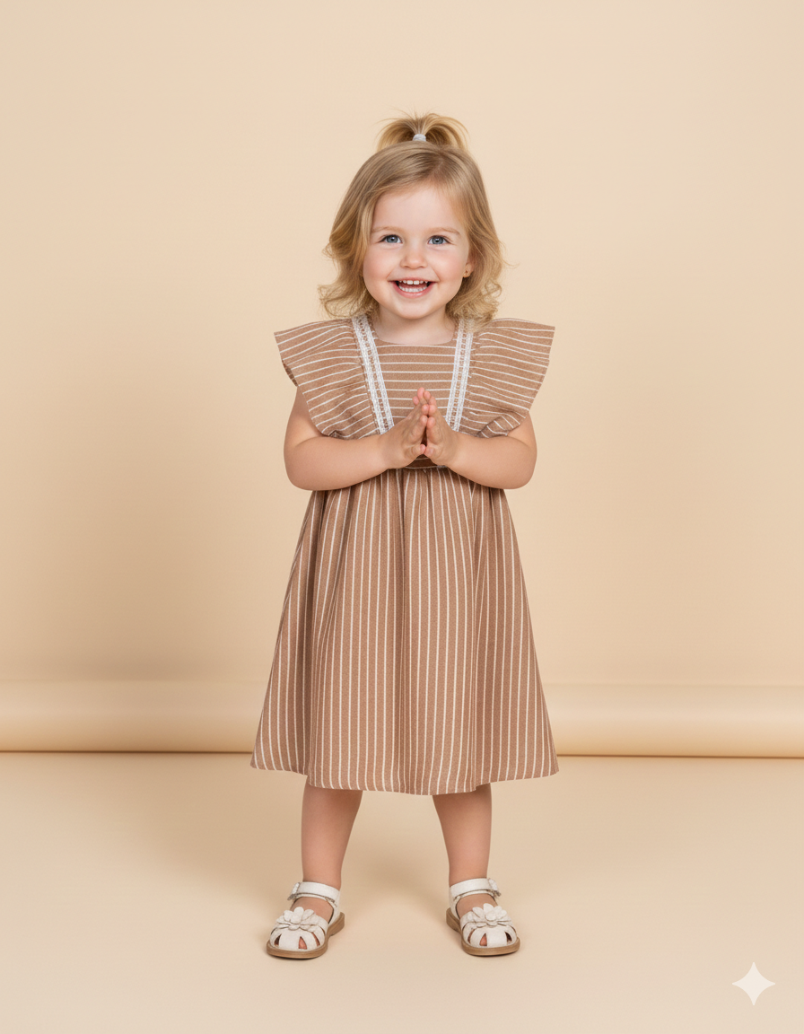 Com design clássico e detalhes delicados, esse vestido é ideal para meninas que gostam de se vestir com charme e sofisticação. A combinação das listras verticais com os acabamentos em renda cria um visual refinado e cheio de personalidade.