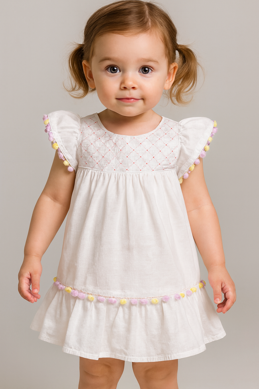 Vestido Maquinetado Branco c/ Pompons e Bordado - Anjos Baby