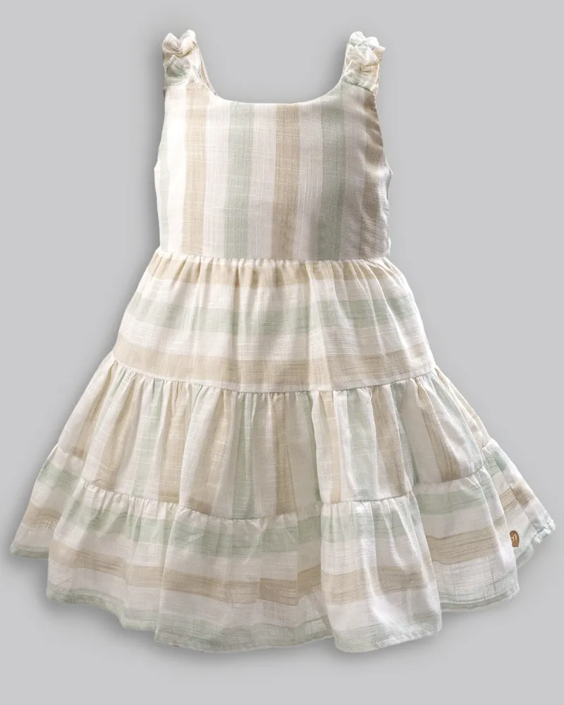 Design: Alças com babadinhos e laços delicados, decote quadrado e saia em camadas com franzidos suaves.